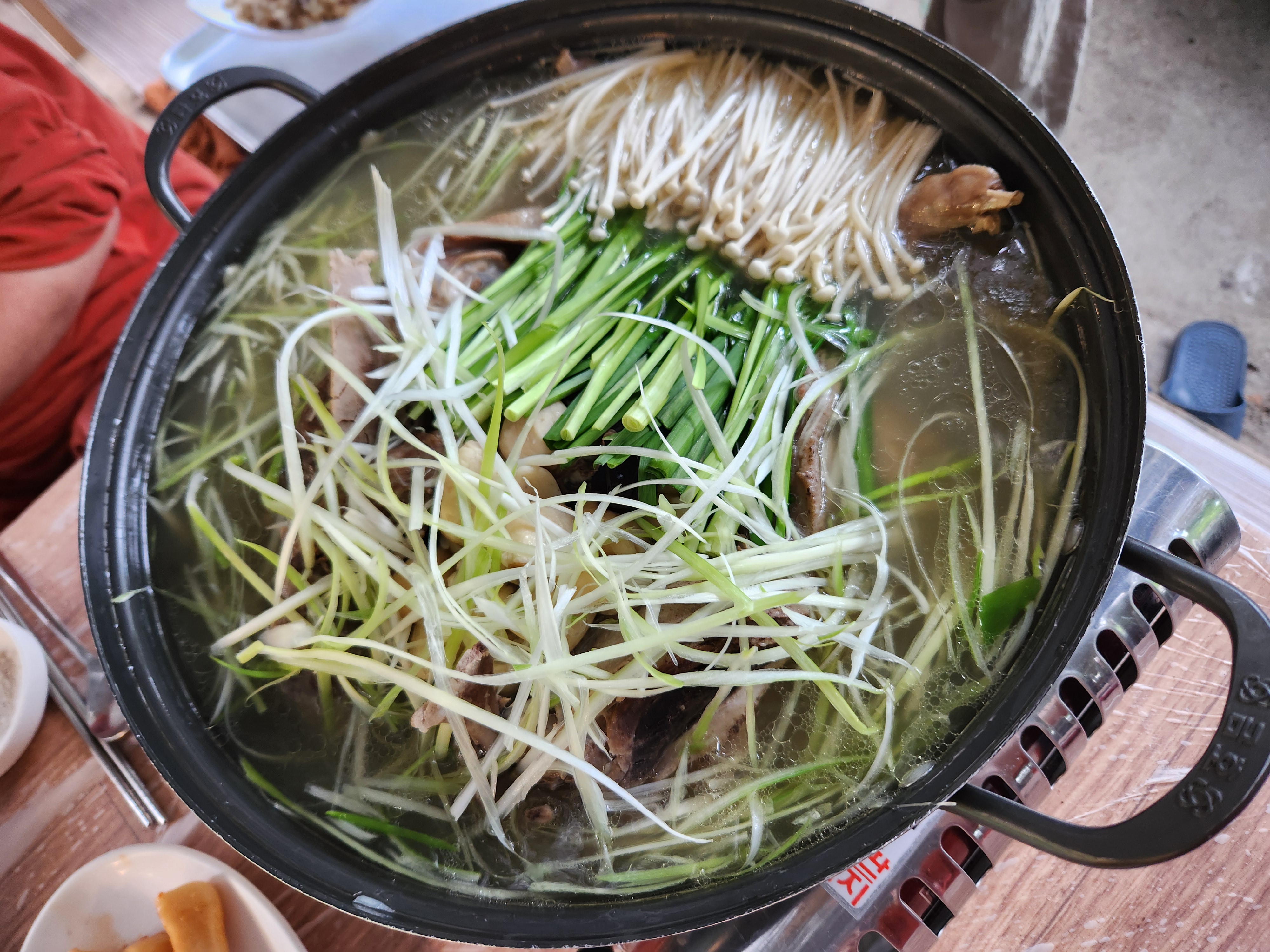 주문하고 시간이 좀 지나니 냄비에 준비되어 나온 오리백숙~~ 군침이 돌더라고요 ㅋㅋ